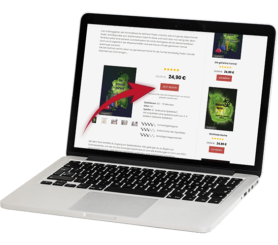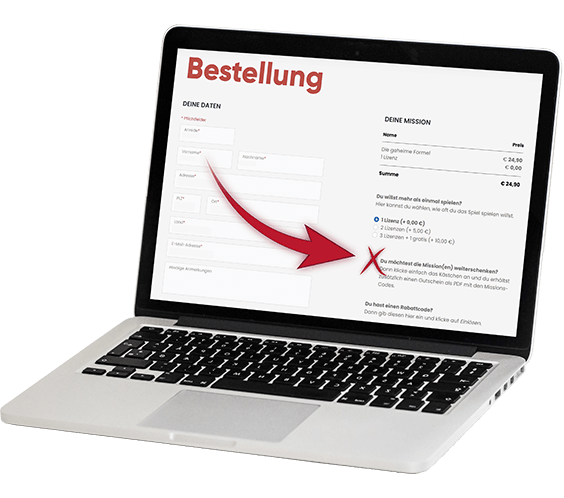 Der Gutschein wird dabei ganz automatisch an die Mission angepasst. Nach dem Kauf erhältst du den Gutschein als PDF-Datei zusammen mit dem Link zum Spielmaterial per E-Mail. Jetzt brauchst du den Gutschein nur noch ganz bequem ausdrucken und dem Spielleiter oder der Spielleiterin deiner Wahl eine ganz besondere Freude machen.